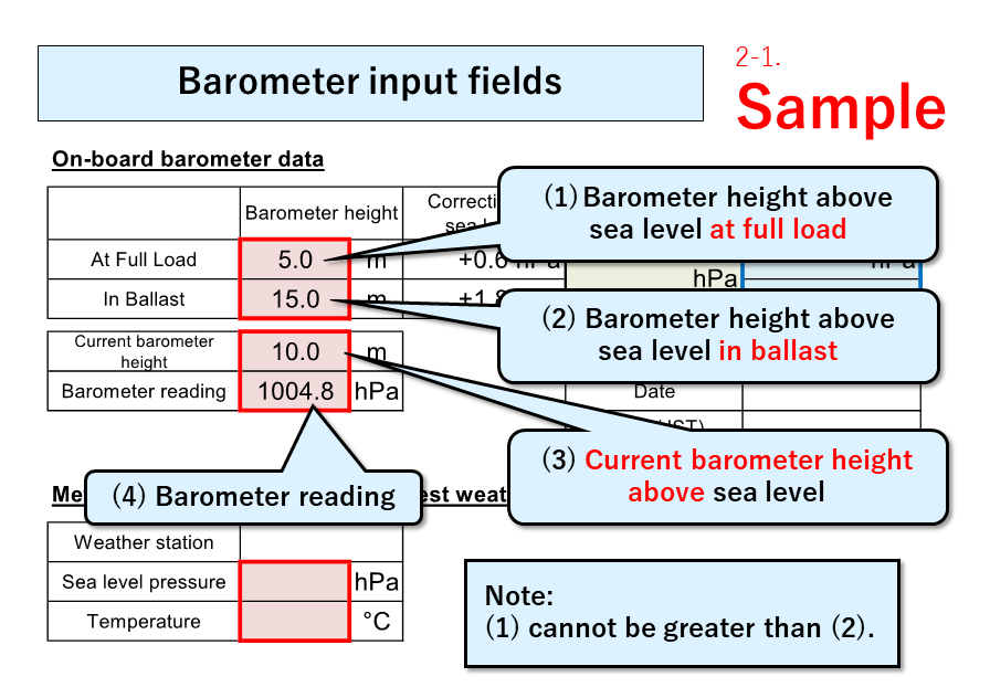 - Barometer heights above sea level both in ballast and at full load (unit: meters)