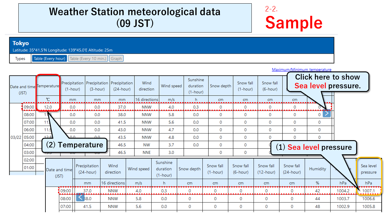 - In this example, at the barometer reading time of 09 JST, the temperature was 12.0°C (red) and the sea level pressure was 1007.1 hPa (orange).